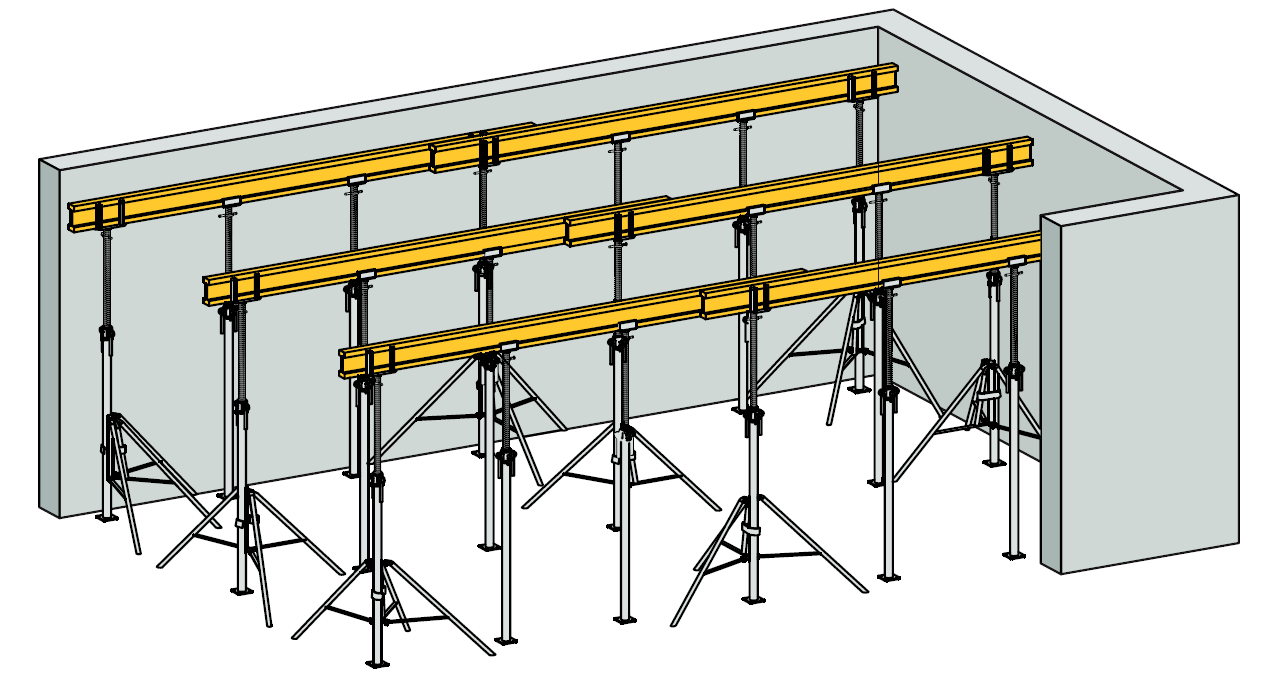 SAFFE-FLEX: is a system for beams and slabs that are designed to be very versatile, fitting into any floor plan and slab thickness. It's made up of just a few high-quality items: H16 wooden beams or H20 wooden beams, props, four-way heads, and tripods. The timber beams are lightweight, easy to handle, and long-lasting.